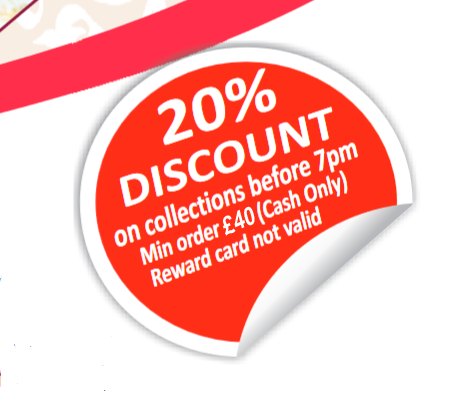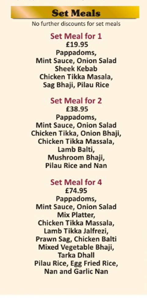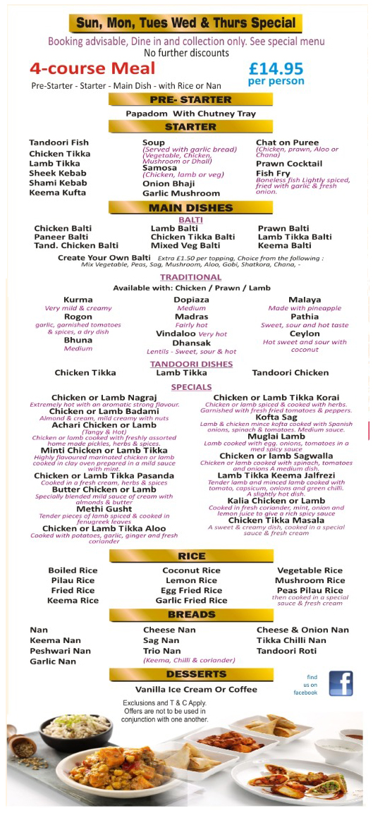 (Booking advisable, Dine in and collection only. See special menu No further discounts)